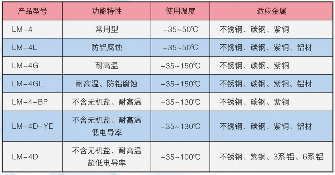 LM-4系列冰河冷媒具有低毒,不易燃,比熱大,安全穩(wěn)定,載冷能力強等優(yōu)點。對碳鋼、不銹鋼、紫銅等金屬防銹性能優(yōu)良。在不同濃度條件下,可以在很寬的溫度范圍內,廣泛應用于各種制冷系統(tǒng)。使用時,根據具體工藝溫度要求單獨使用或用水稀釋成適當濃度后應用。如與醇類載冷劑混合使用,應加入適量的冰河冷媒增效劑。其中: