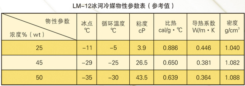 本品適用于保鮮庫、冷藏庫、低溫庫做間接制冷載冷劑使用。使用時(shí)先將系統(tǒng)清洗干凈,然后根據(jù)庫溫將本品加水稀釋到指定濃度使用,具體使用濃度,及物性參數(shù)參考下表。
