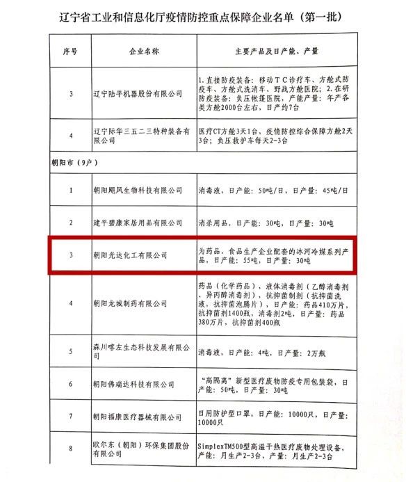 冰河冷媒被列入“遼寧省疫情防控重點保障企業(yè)”名單