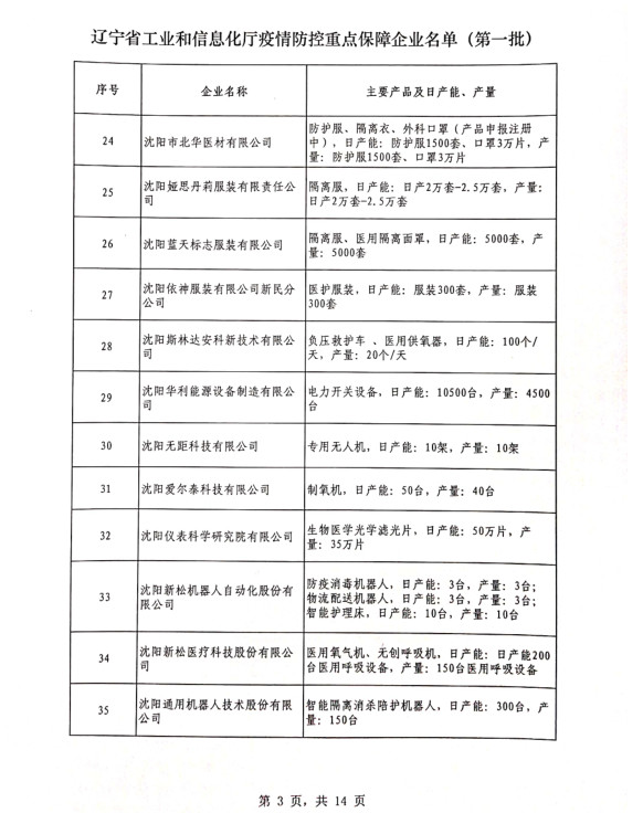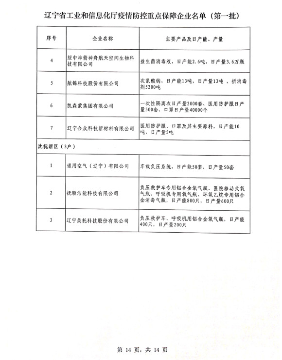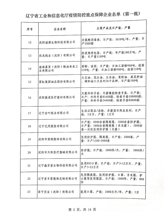 為貫徹落實習(xí)近平總書記關(guān)于疫情防控工作的重要講話和指示批示精神,落實黨中央、國務(wù)院和省委、省政府有關(guān)部署,按照《遼寧省人民政府關(guān)于印發(fā)遼寧省應(yīng)對新型冠狀病毒感染的肺炎疫情支持中小企業(yè)生產(chǎn)經(jīng)營若干政策措施的通知》(遼政發(fā)【2020】6號)和《遼寧省工業(yè)和信息化廳關(guān)于規(guī)范省級疫情防控重點保障企業(yè)名單管理有關(guān)事項的通知》(遼工信明電【2020】35號)要求,在各市審核推薦的基礎(chǔ)上,經(jīng)我廳認真研究,決定以下150戶企業(yè)納入遼寧省工業(yè)和信息化廳疫情防控重點保障企業(yè)名單(第一批)。