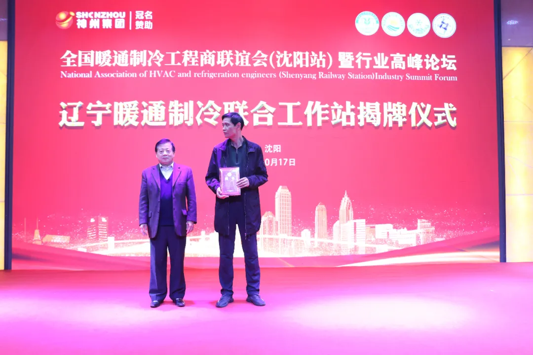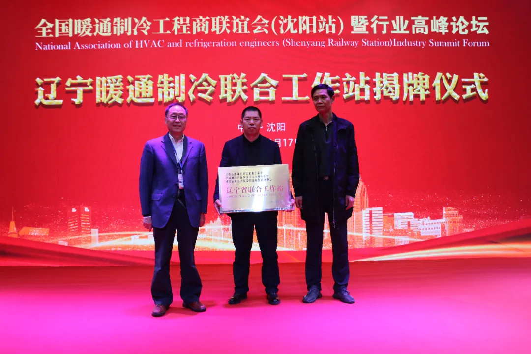 黃建忠司長和吳建國理事長為遼寧暖通制冷聯(lián)合工作站揭牌,并由工作站站長于文濤接牌。