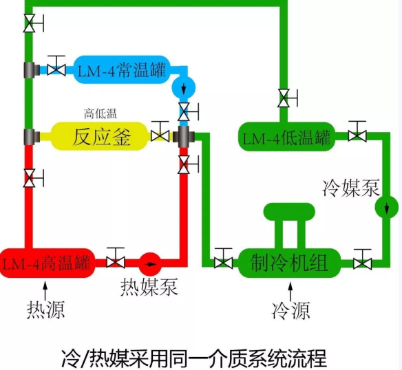 冰河冷媒科技有限公司與醫(yī)藥、化工、制冷等行業(yè)皆有深入合作,針對(duì)常規(guī)冷熱切換工藝存在的缺陷,將工藝優(yōu)化為如圖所示的LM-4冰河冷媒換熱控制系統(tǒng)。