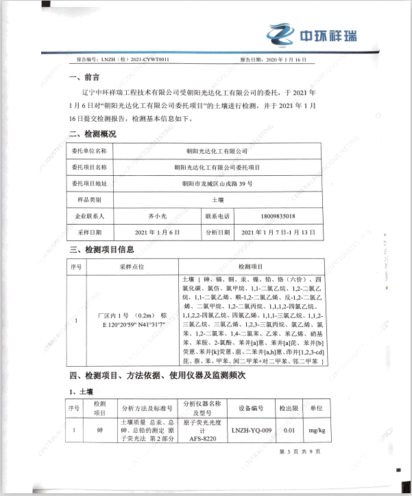 朝陽光達(dá)化工有限公司老廠區(qū)土壤檢測報(bào)告公示