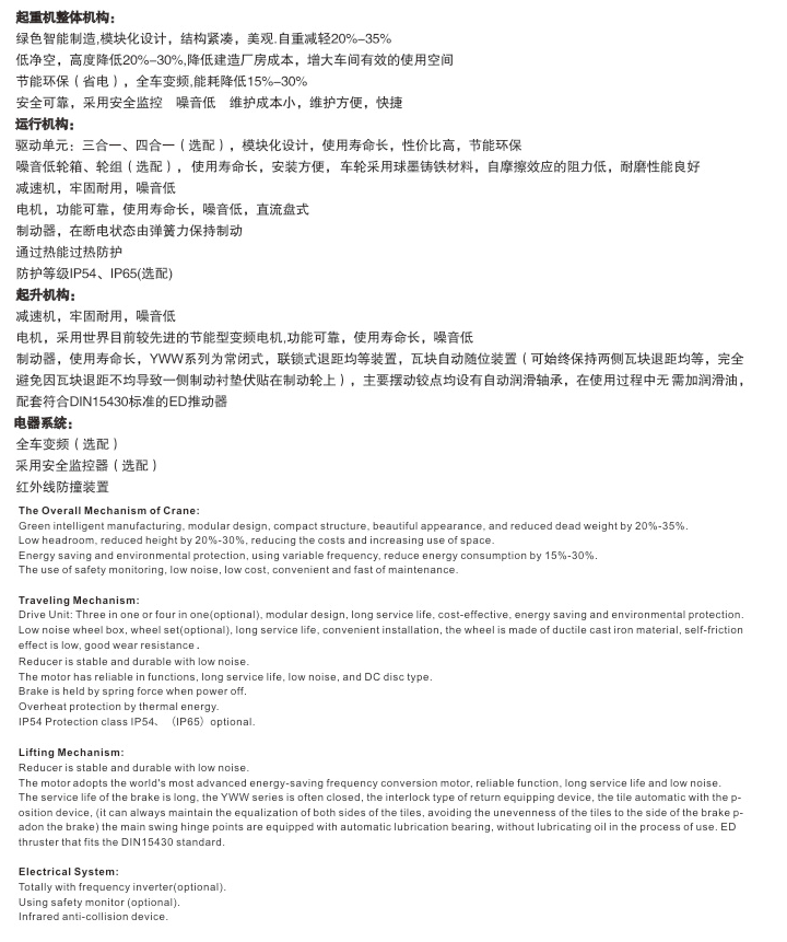 低噪音、免維護(hù)(降低檢修時(shí)間及維護(hù)成本低)(因結(jié)構(gòu)簡(jiǎn)單,故配套件品種少,后期方便采購(gòu),同時(shí)也降低了庫(kù)存)。我公司的歐標(biāo)起重機(jī)通過(guò)變頻器調(diào)速,能有效減少用電量20%-30%,降低了使用成本,提高了使用效率。